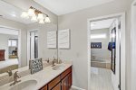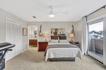 The master bedroom on the first floor beckons with a regal king-sized bed and a private bath, ensuring a retreat of unparalleled relaxation. A guest bedroom, complete with a queen bed and a well-appointed hall bath, adds to the allure of the ground level. Ascend upstairs to discover the third bedroom, complete with its private bath, providing a serene space with elevated vistas.