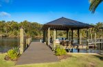 The panoramic views across the waterway are nothing short of breathtaking, accentuated by two docks and a floating deck nestled between them. The lift can comfortably accommodate a 40' boat, while the gas fire pit sets the scene for captivating sunsets. A brick patio and summer kitchen overlook the inviting blue waters of the pool and spa, creating an idyllic setting for relaxation and entertainment.